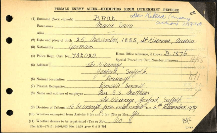 It is not known how the Brods found work at the vicarage in Yoxford. Perhaps there was a diocesan appeal for placements. The Brods were among at least twelve refugee domestics employed by clergy families across rural Suffolk. Householders could apply for permits to employ up to two foreign domestics and undertook to pay them no less than £36 yearly so as to avoid undercutting British workers.