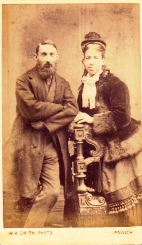 This anonymous couple were captured at Smith’s Photographers, Brook Street, Ipswich, probably in the 1870s. The studio was opposite a silverware shop run by the Levy family. (The building is still there and the shop has been trading as ‘Mattressman’ until recently). The Levys were members of a small and rapidly dwindling Jewish community living in Ipswich. Is it too far-fetched to speculate that the couple were members of the Levy family? The portrait was produced as a carte de visite – a type of small photo the size of a visiting card which became popular and collectable throughout Europe and America from the 1860s.